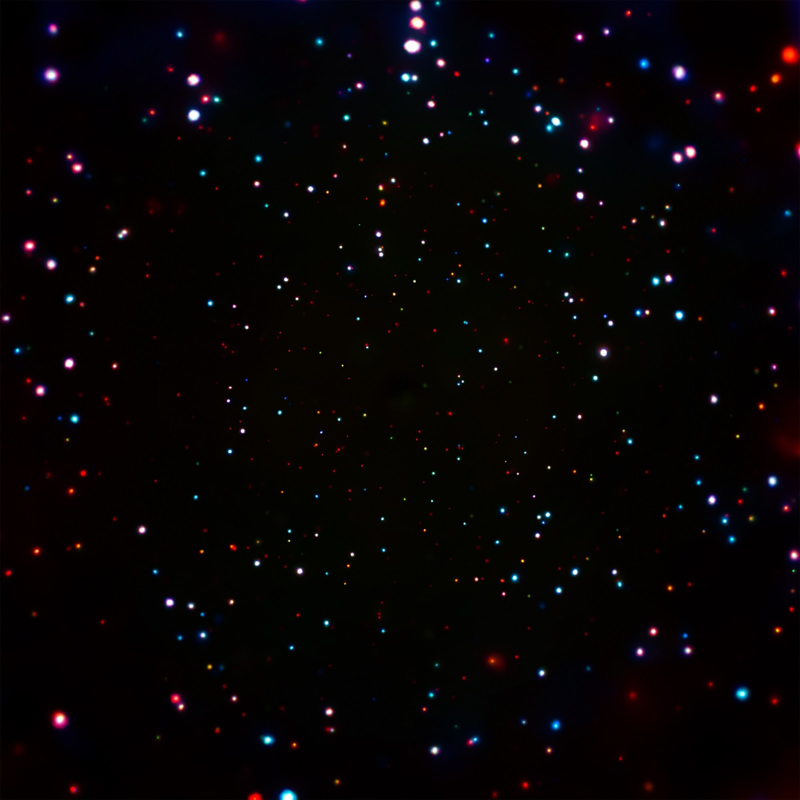 The image is from the Chandra Deep Field-South, or CDF-S. The full CDF-S field covers an approximately circular region on the sky with an area about two-thirds that of the full Moon. However, the outer regions of the image, where the sensitivity to X-ray emission is lower, are not shown here. The colors in this image represent different levels of X-ray energy detected by Chandra. Here the lowest-energy X-rays are red, the medium band is green, and the highest-energy X-rays observed by Chandra are blue.